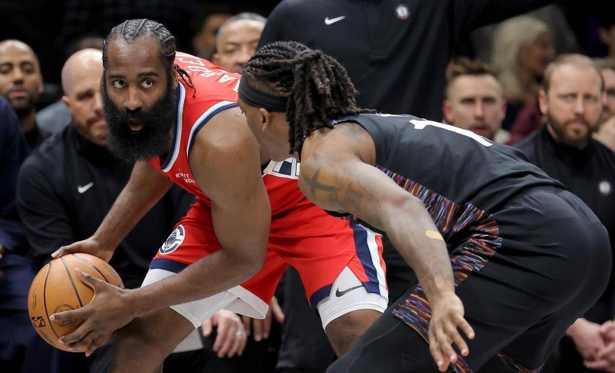 更离谱的是,他全场就靠罚球拿了5分,一个运动战进球都没有,还整出4个失误。 哈登好几个饼喂到嘴边了,他硬是吃不下,要么扣篮被篮筐盖了,要么勾手砸前框。